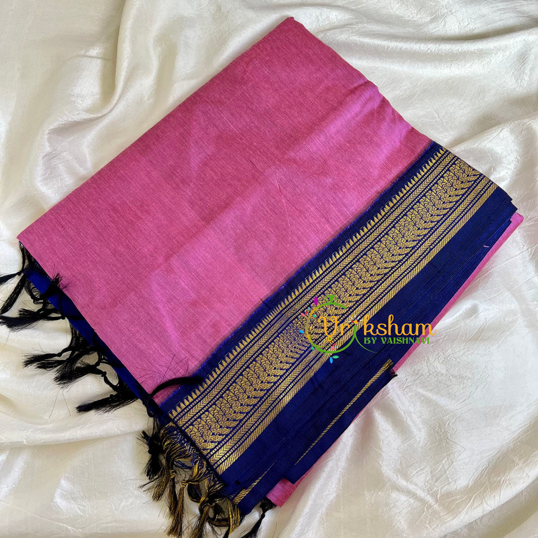 Candy Pink Saree with Blue Border-Kalyani Cotton - comes with Blouse attached. Contrast border saree. Poly mix cotton.