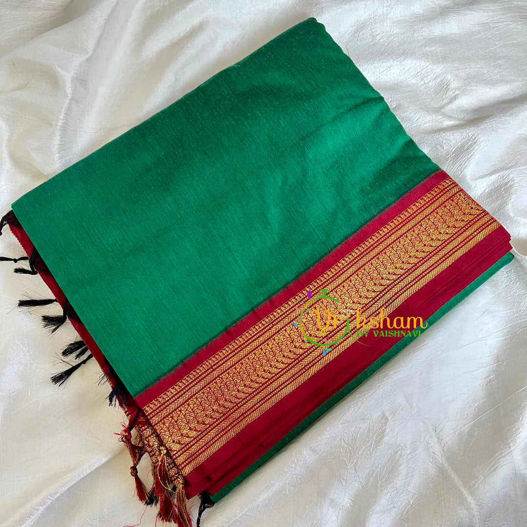 Dark Green Saree with Maroon Border- Kalyani Cotton - comes with Blouse attached. Contrast border saree. Poly mix cotton.