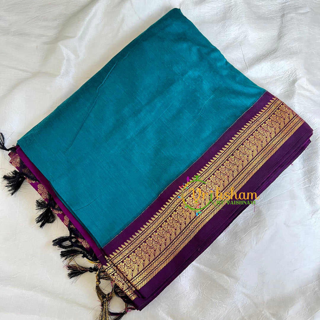 Teal Saree with Purple Border- Kalyani Cotton - comes with Blouse attached. Contrast border saree. Poly mix cotton.