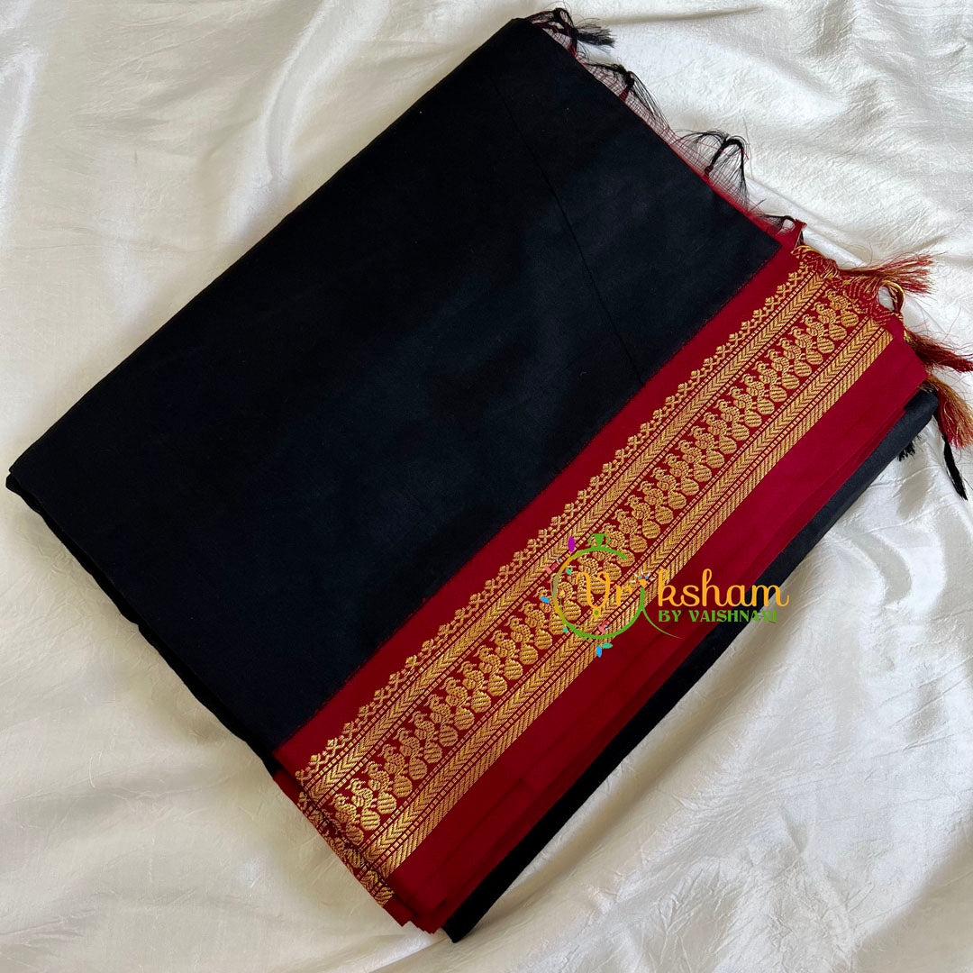 Black Saree with Maroon border- Kalyani Cotton - comes with Blouse attached. Contrast border saree. Poly mix cotton.