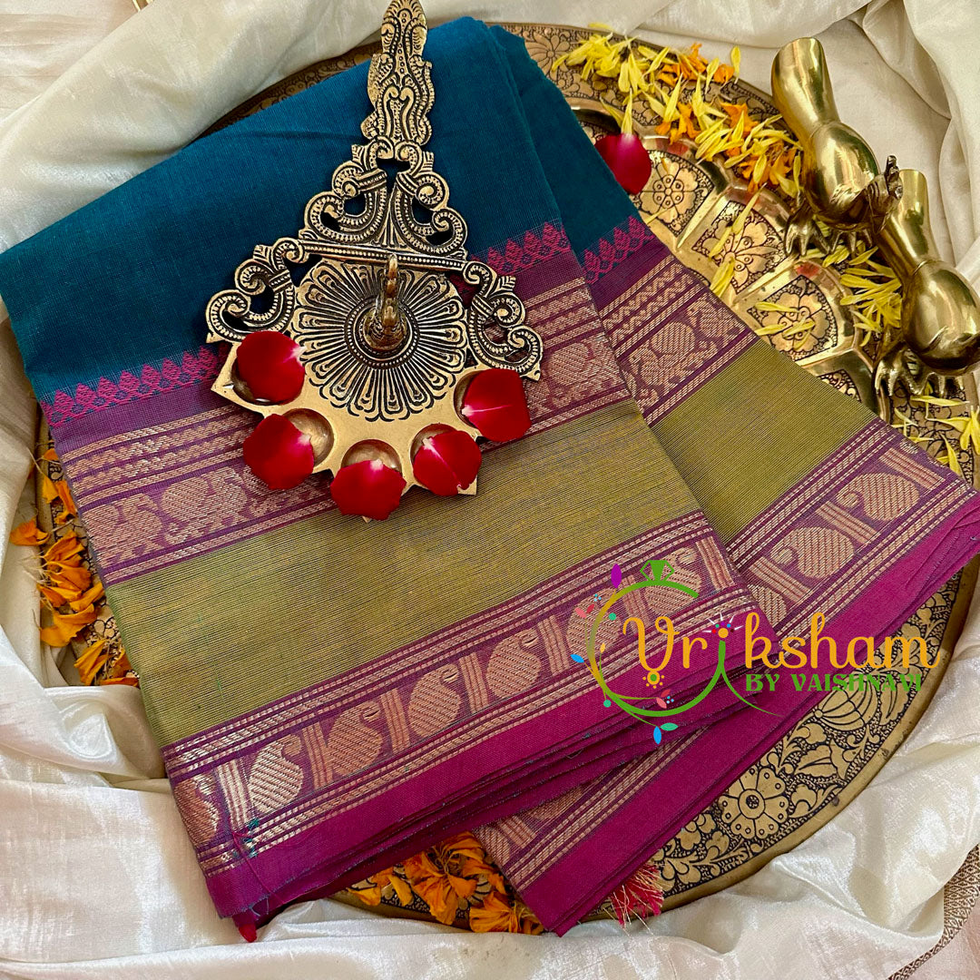 Colour and Material:  Peacock Blue  with purple and olive green retta pet border Kanchi Cotton Saree  ; Pure 100% cotton with traditional kanchi border.