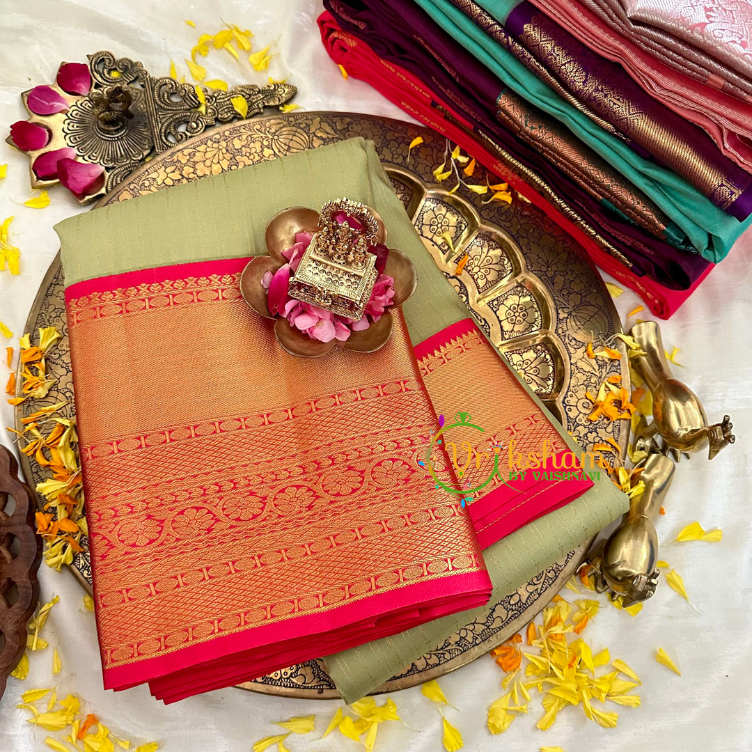 Traditional Pista Green with Red Kanchi Pure Silk Saree- Festive wear kanchi silk saree – tree zari pattern throughout the saree; comes with Blouse attached. Handloom Silk.