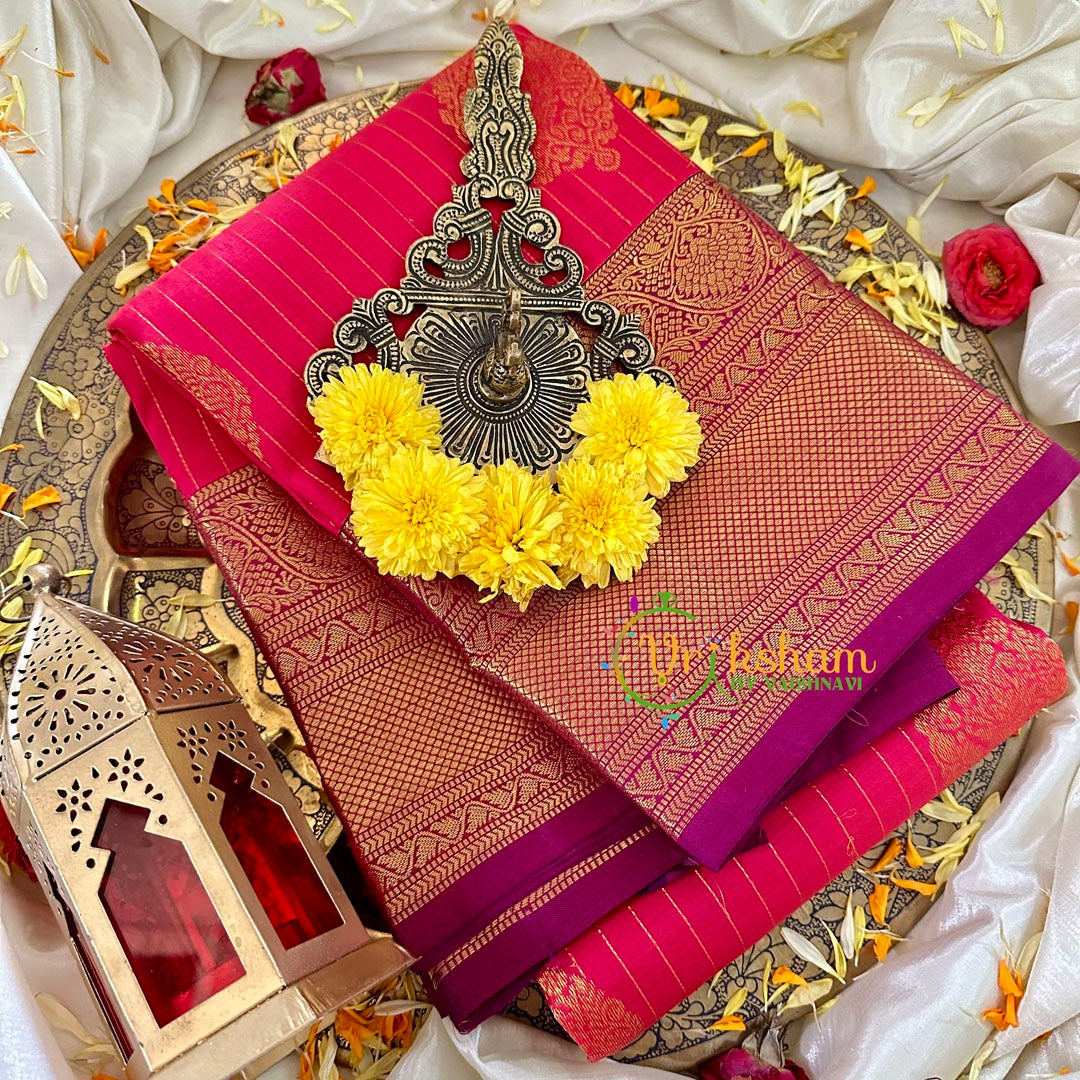 Rani Pink Kanchi Pure Silk Saree- Festive wear kanchi silk saree – veldari and big butta pattern throughout the saree; comes with Blouse attached. Handloom Silk.
