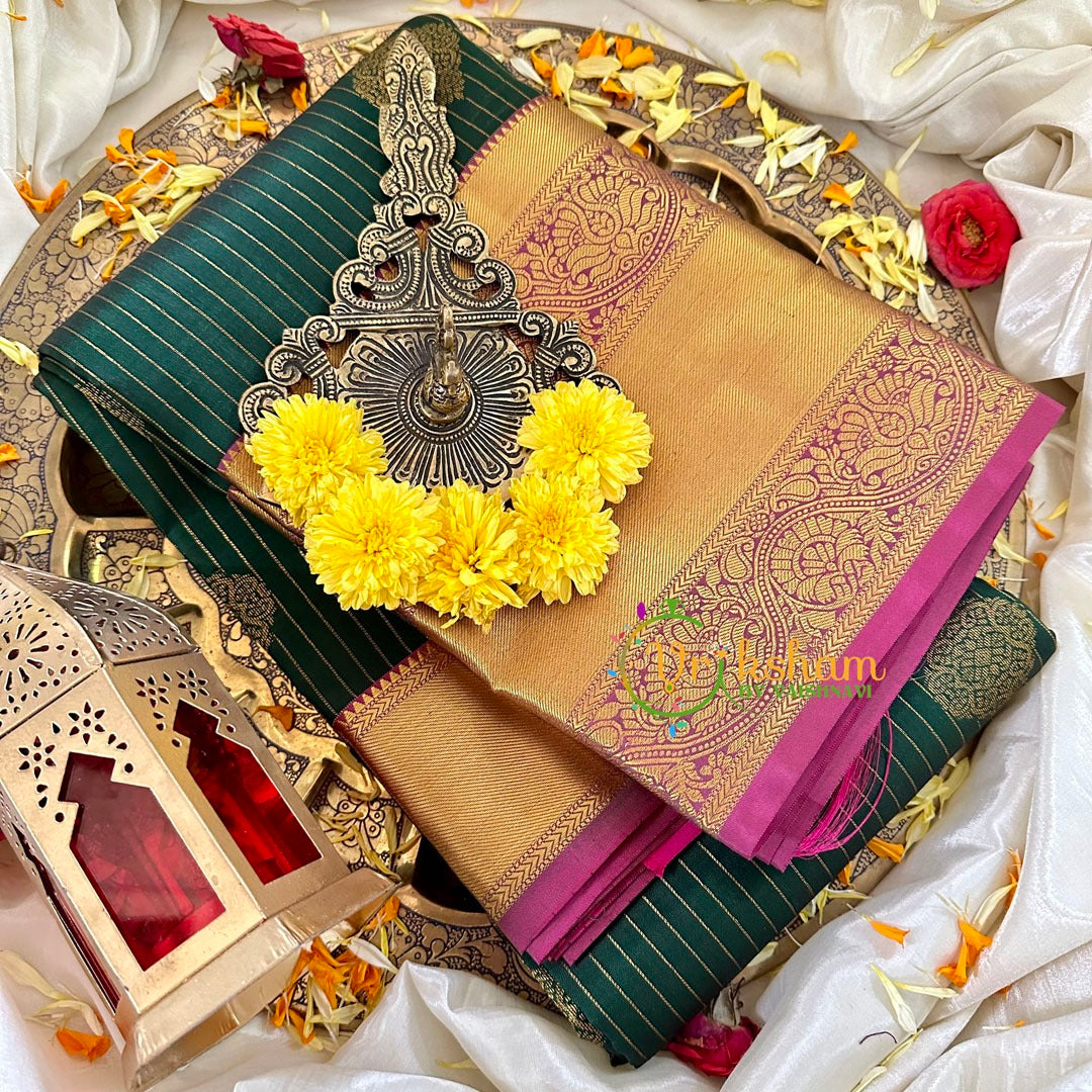 Bottle Green with Violet Pink Kanchi Pure Silk Saree- Festive wear kanchi silk saree – Veldari Lines with Big Butta pattern throughout the saree; comes with Blouse attached. Handloom Silk.
