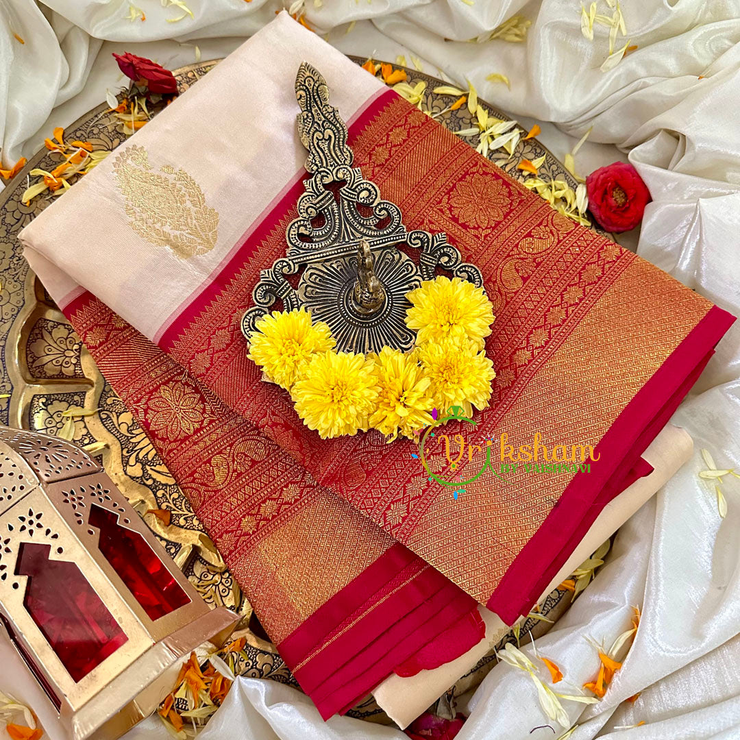 Half White with Red Kanchi Pure Silk Saree- Festive wear kanchi silk saree – butta pattern throughout the saree; comes with Blouse attached. Handloom Silk.