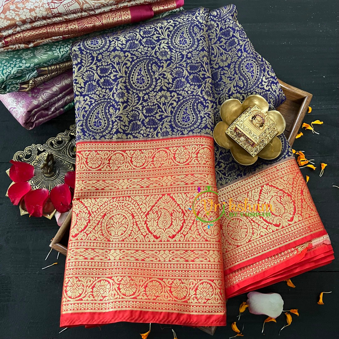 Blue Silk with Red Border Saree-Kanchi Silk Saree - Festive wear saree – Pattern throughout the saree; comes with Blouse attached. One side Big Border and other side lean border. Power loomed saree.