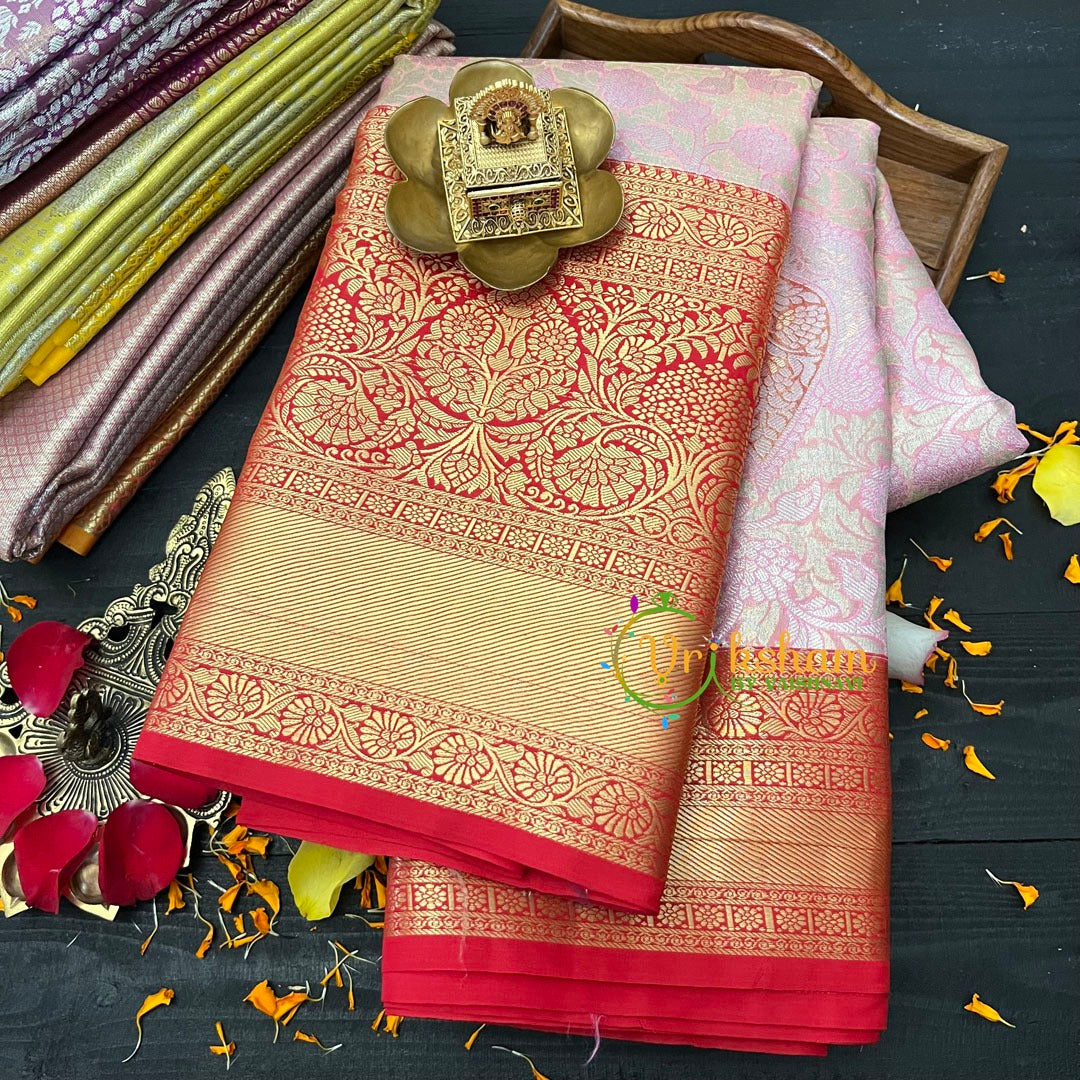 Light Pink Silk with Red Border Saree-Kanchi Silk Saree - Festive wear saree – Pattern throughout the saree; comes with Blouse attached. One side Big Border and other side lean border. Power loomed saree.