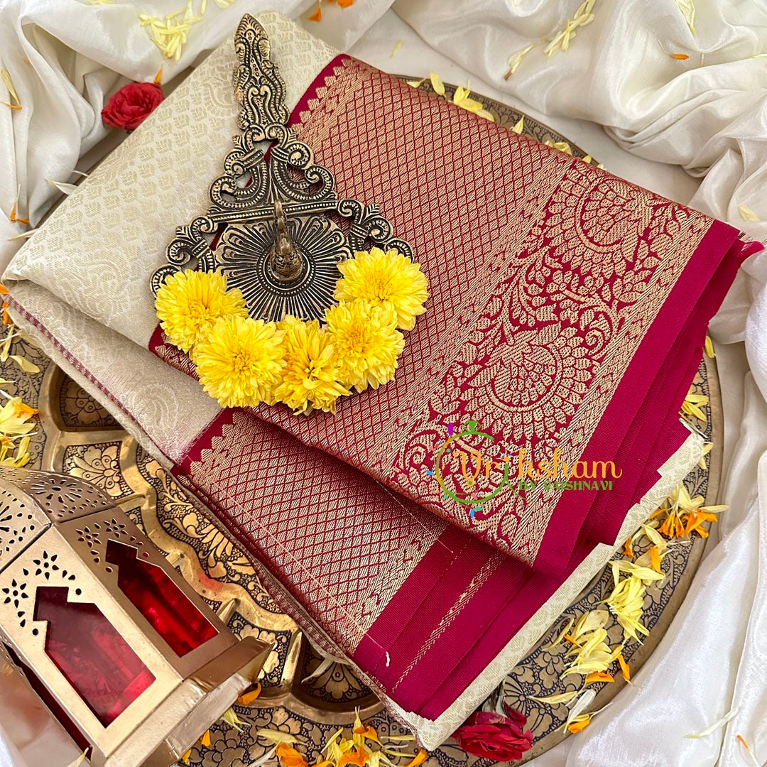 Half White with Red Kanchi Silk – Festive wear saree – Pattern throughout the saree; comes with Blouse attached. Power loomed saree.