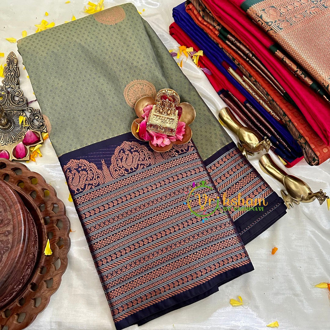 Pista Green with Dark Blue Silk Saree -Kanchi Silk – Festive wear saree –Self Pattern throughout the saree; comes with Blouse attached. Power loomed saree.