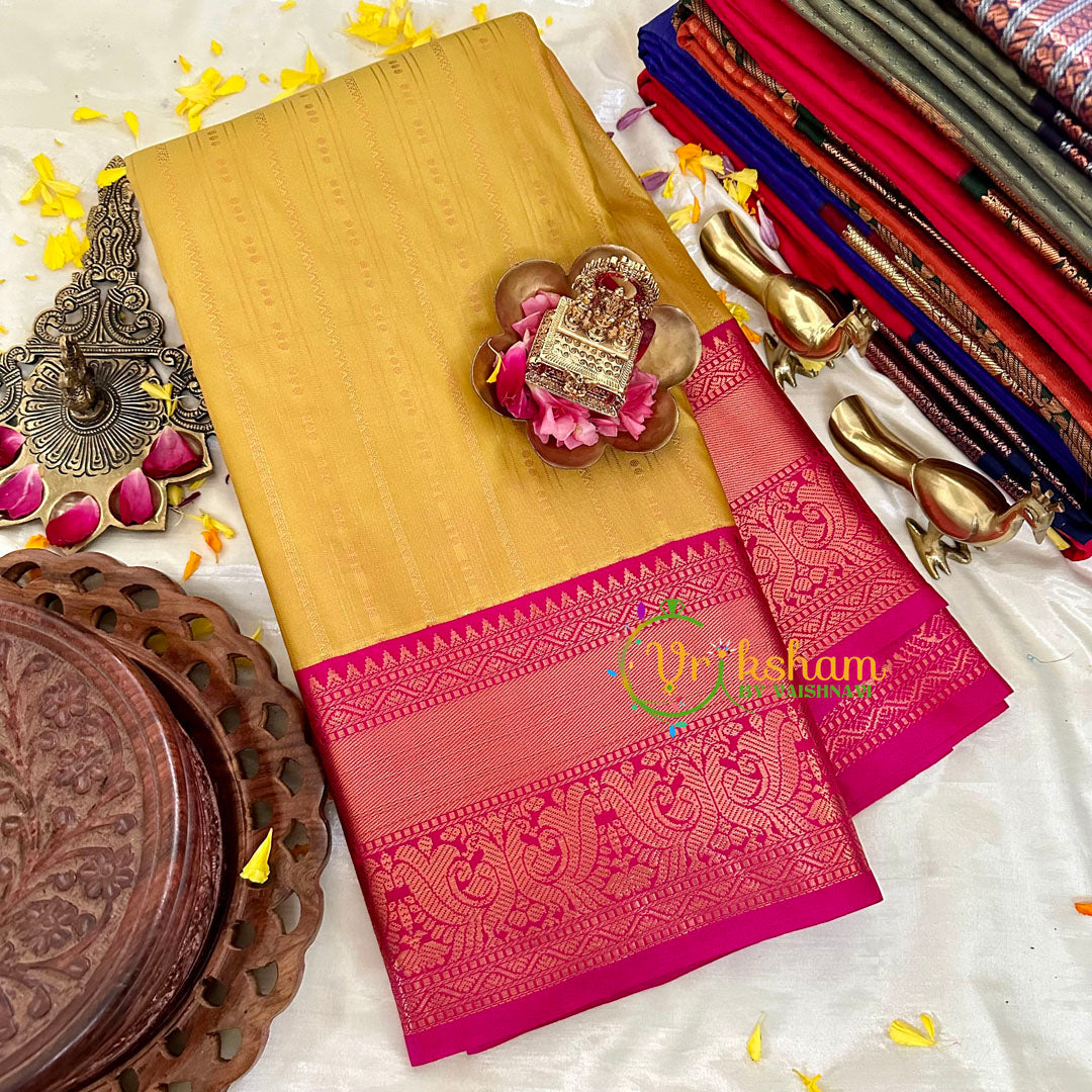 Yellow with Pink Silk Saree -Kanchi Silk – Festive wear saree –Big Border saree; comes with Blouse attached. Power loomed saree.
