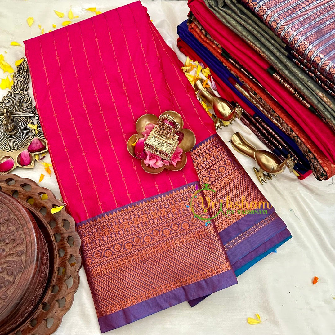 Pink with Purple Silk Saree -Kanchi Silk – Festive wear saree – Line Pattern with dots throughout the saree; comes with Blouse attached. Power loomed saree.