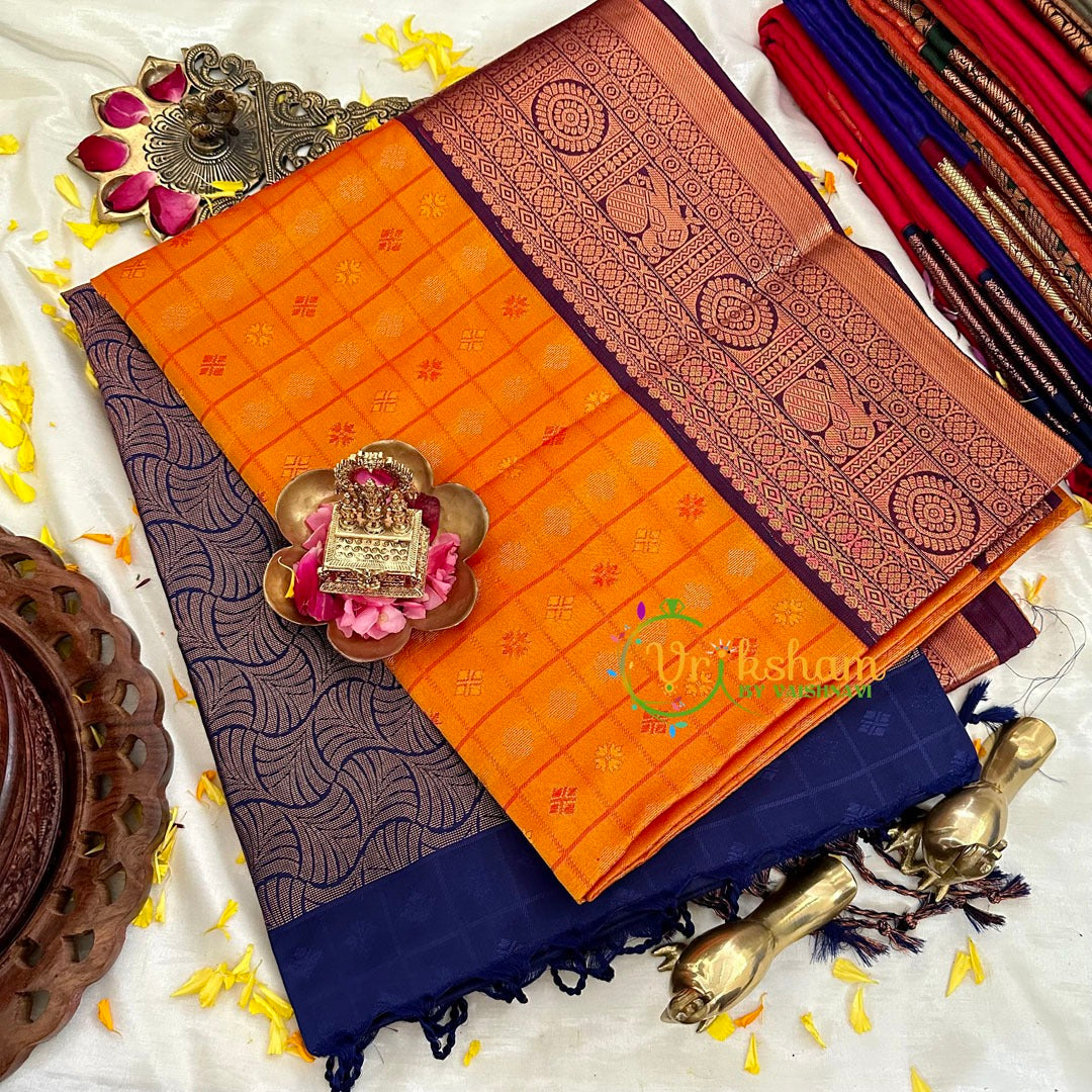 Orange Kattam Butta Silk Saree -Kanchi Silk – Festive wear saree –Kattam Butta (small) Pattern throughout the saree; comes with Blouse attached.