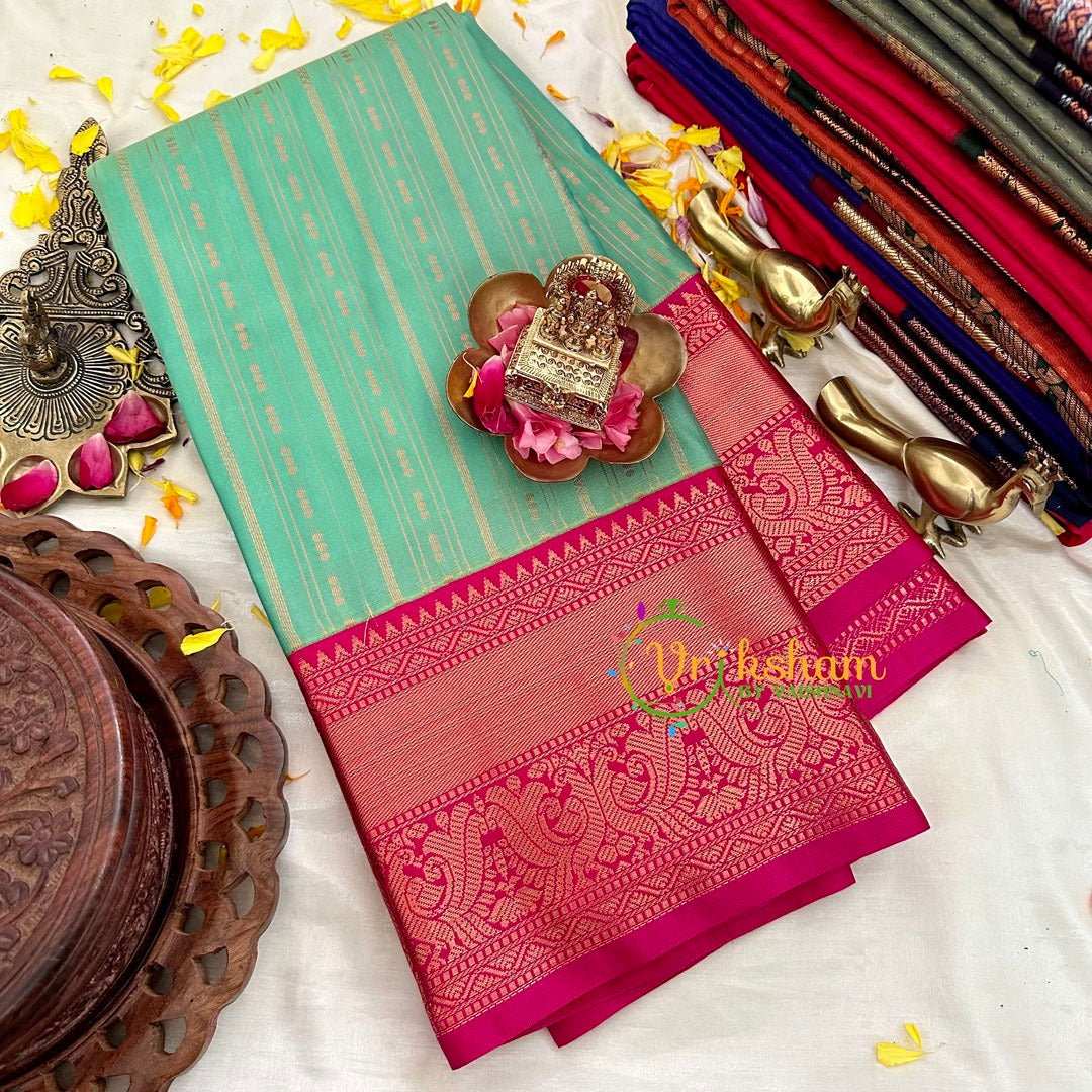 Mint Green with Pink Veldhari Silk Saree-Kanchi Silk – Festive wear saree –Veldhari Pattern throughout the saree; comes with Blouse attached. Power loomed saree.