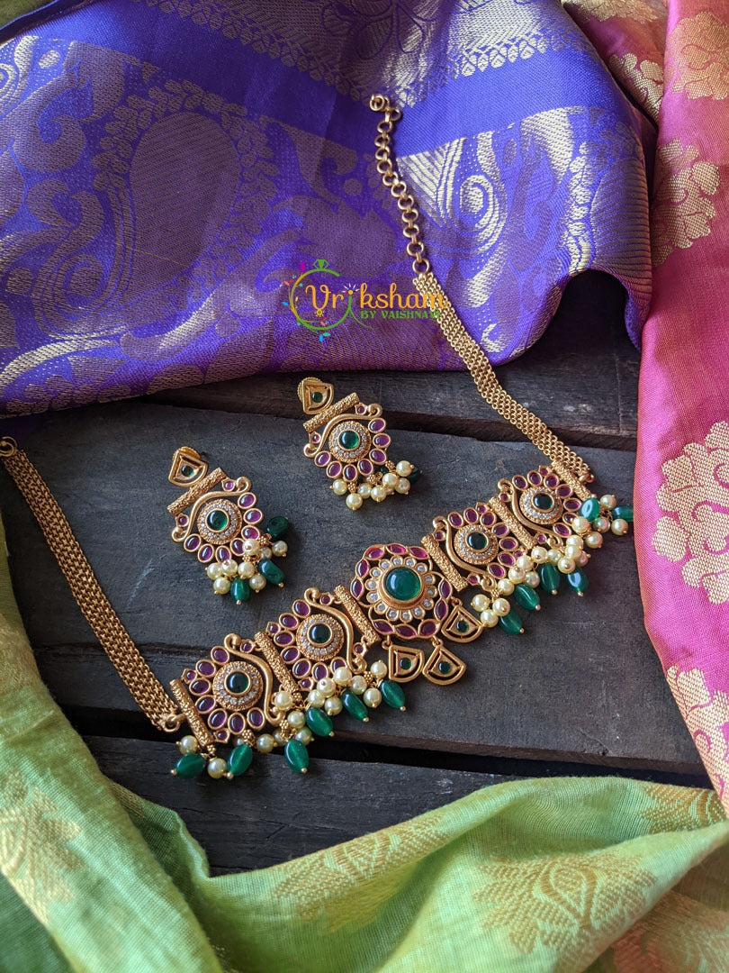 Kemp and AD Stone High Neck Choker -Premium quality high neck choker with kemp and AD stone studded; green bead and pearl finish, comes with matching earrings.
