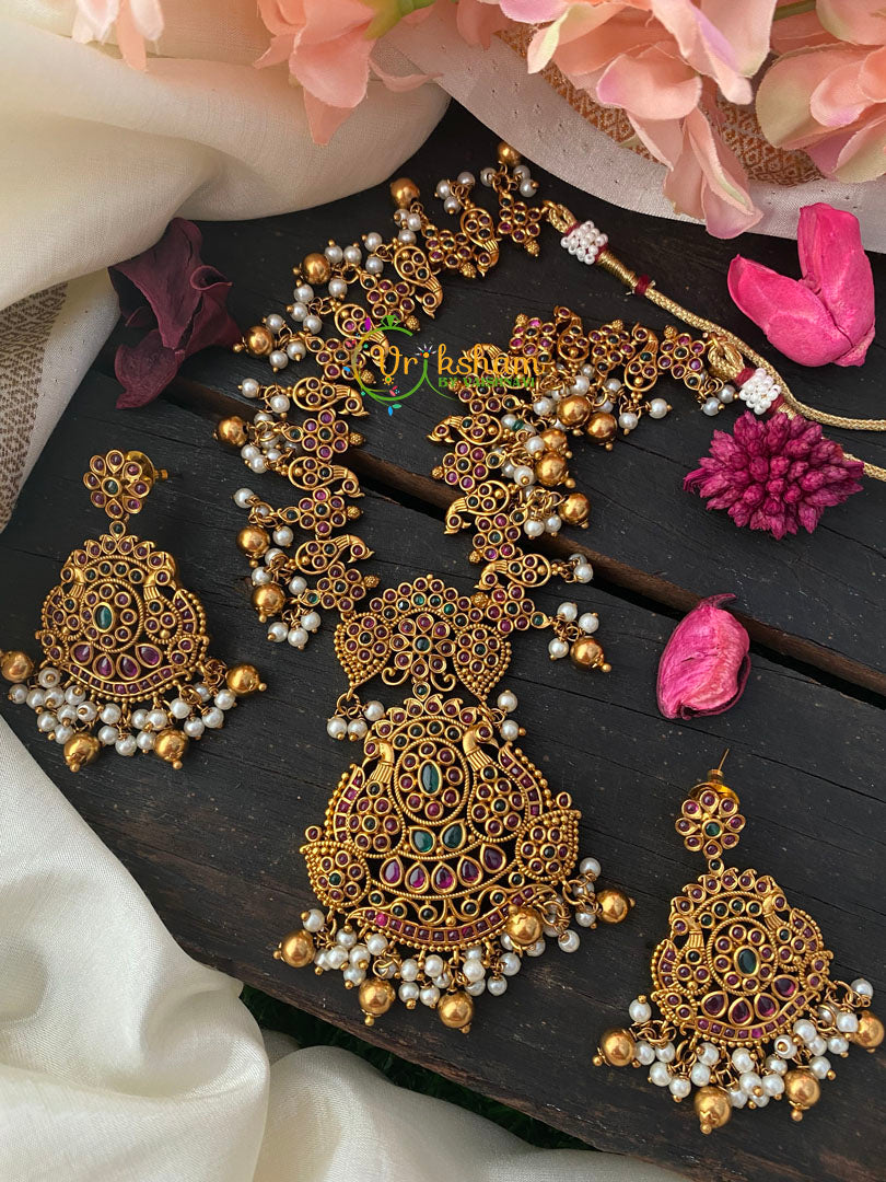 Precious Kemp and AD Stone Short Neckpiece. Premium Antique Finish Gold look alike kemp and ad stone Choker -peacock and floral pattern. Comes with matching danglers.