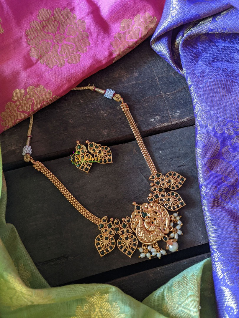 The picture of Vaishnavi wearing the neckpiece is for reference purposes only. The neckpiece is green stoned only.