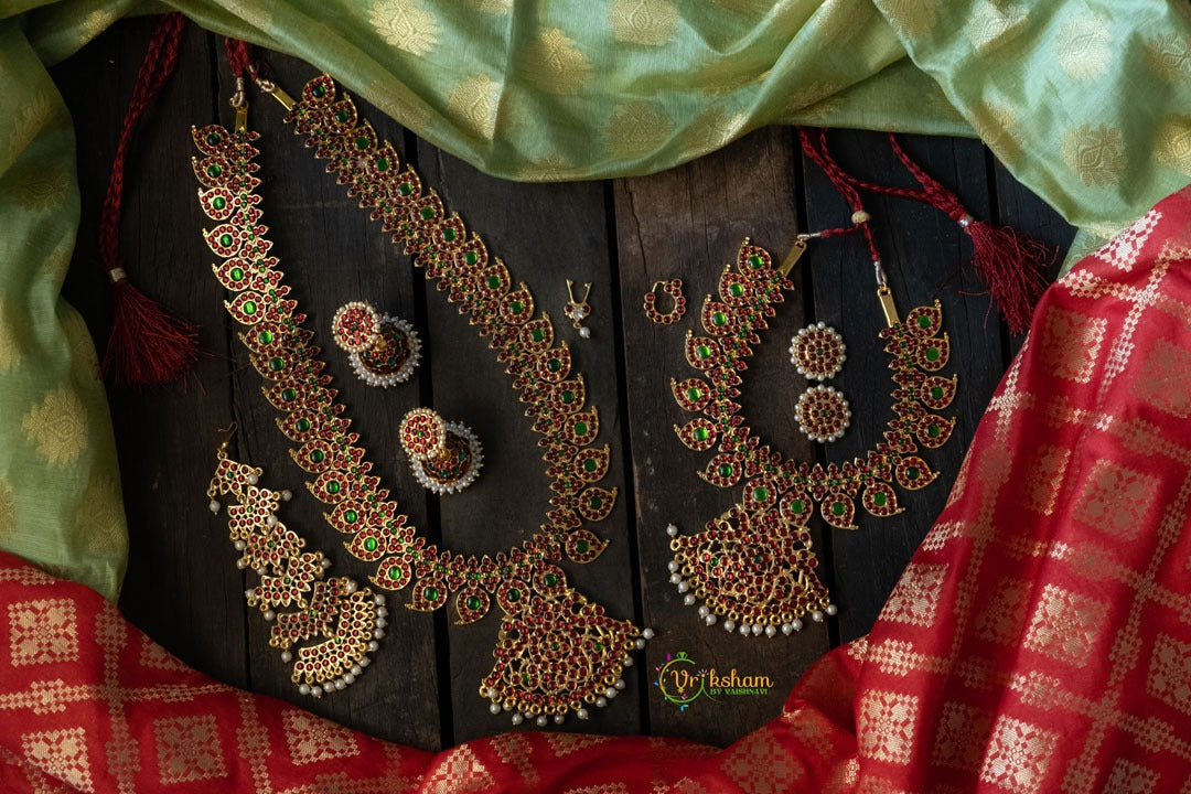 Kemp combo of long haaram and short neckpiece with jhumkas and studsand a tikka.Kemp series as already stated any design of Kemp that you require which can be handmade can be done. These are not precious Kemp stones. They are imitation. But they are handmade.Vriksham in an effort to support handmade jewelry has ventured into this. Looking forward for all of your support as always.
