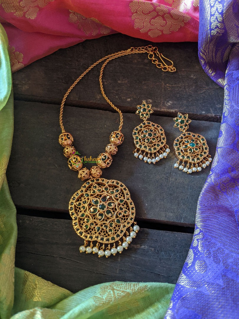MAKE MATERIAL – This beautiful Precious Kemp Neckpiece with earrings is made of gold look alike finish with precious Green Kemp stones.