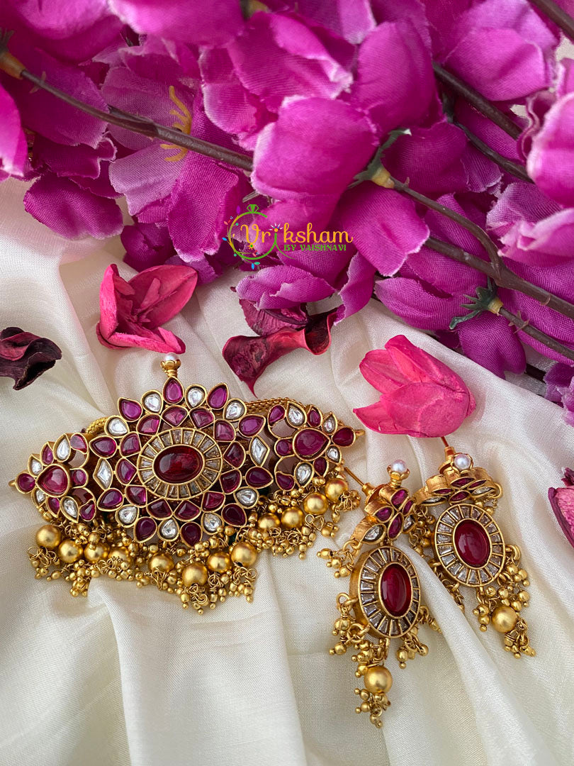 Premium Kemp High neck Choker -Red- GOLD BEAD FINISH -Centre RED stone and white – Gold look alike, floral pattern stone studded, Golden finish. Comes with a pair of earrings.