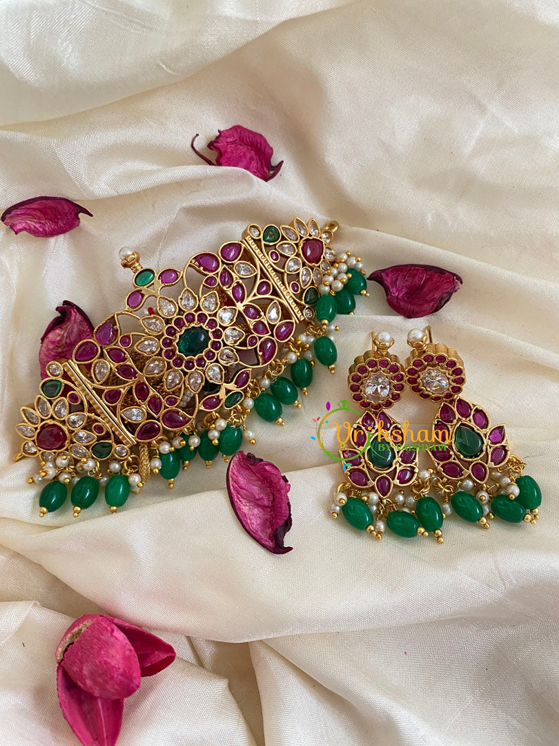Premium Kemp High neck Choker -GREEN BEAD FINISH -Centre Green stone and white, red– Gold look alike, floral pattern stone studded, Green bead pearl finish. Comes with a pair of earrings.
