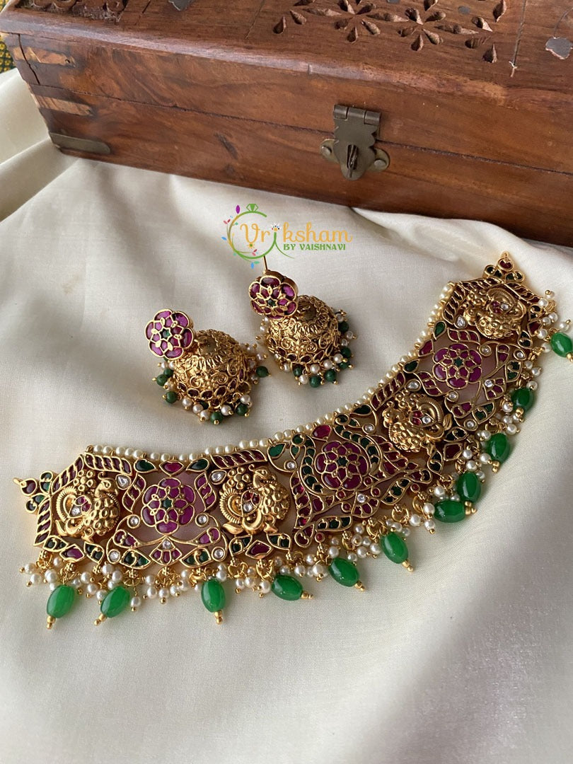 Premium Kemp High Neck Choker -Temple Choke-Green and Red kemp; white AD stone studded premium quality high neck choker; Pearl Green bead & ghungroo finish. Temple make look. Comes with matching jhumkas.