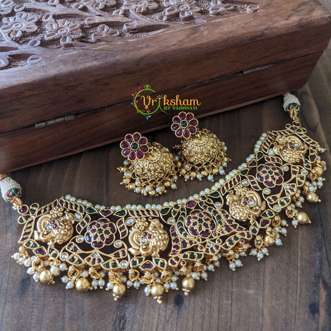 Premium Kemp High Neck Choker -Green and Red kemp; white AD stone studded premium quality high neck choker; Pearl & ghungroo finish. Temple make look. Comes with matching jhumkas.