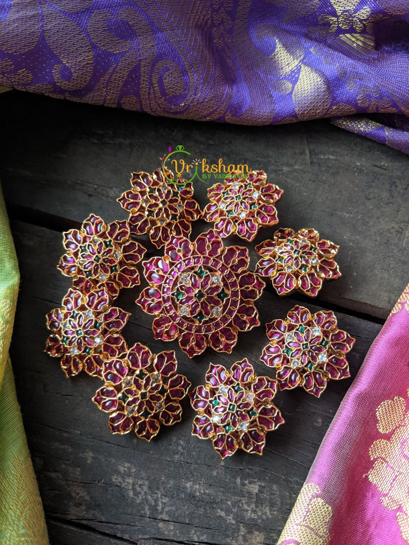 Kemp Jada Billai -Flower Pattern -Green, Red and White stones , centre - green stones. All are original semi precious Kemp stones. One bigger piece, and eight similar sized pieces. 9 pieces will come together only.