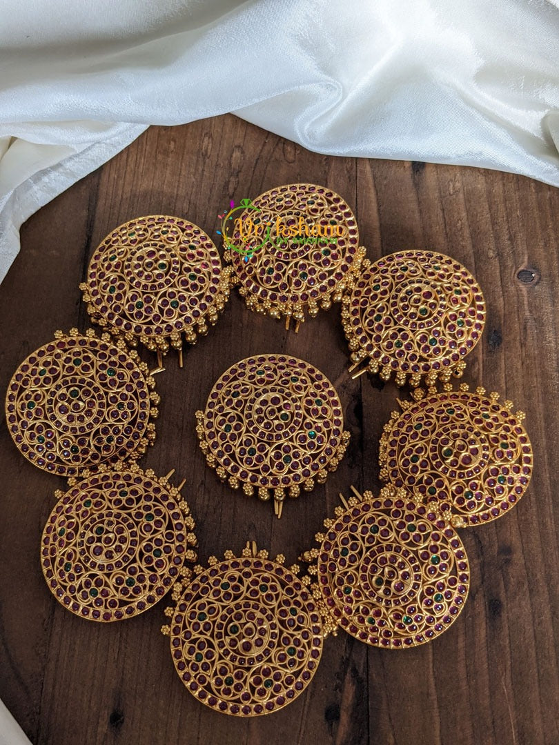 Kemp Jada Billai -Round Flower Pattern -Green and Red, centre – peacock stones. All are original semi precious Kemp stones. 9 pieces will come together only.