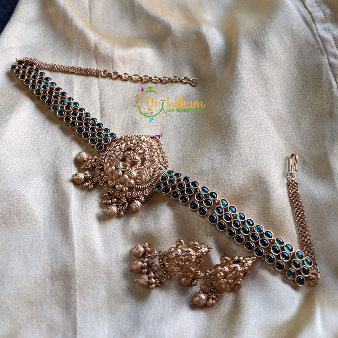 Premium Kemp Lakshmi High Neck Choker -Temple Choker -Green Three layered kemp with chain ends and Centre Lakshmi Pendant and ghungroo finish, comes along with Lakshmi studs.