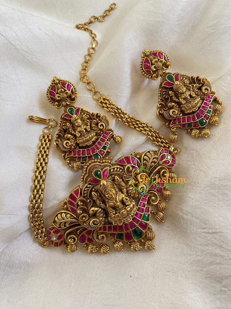 Red Green Kemp Lakshmi High Neck Choker -Centre Lakshmi Pendant and ghungroo finish, comes along with Lakshmi earrings.