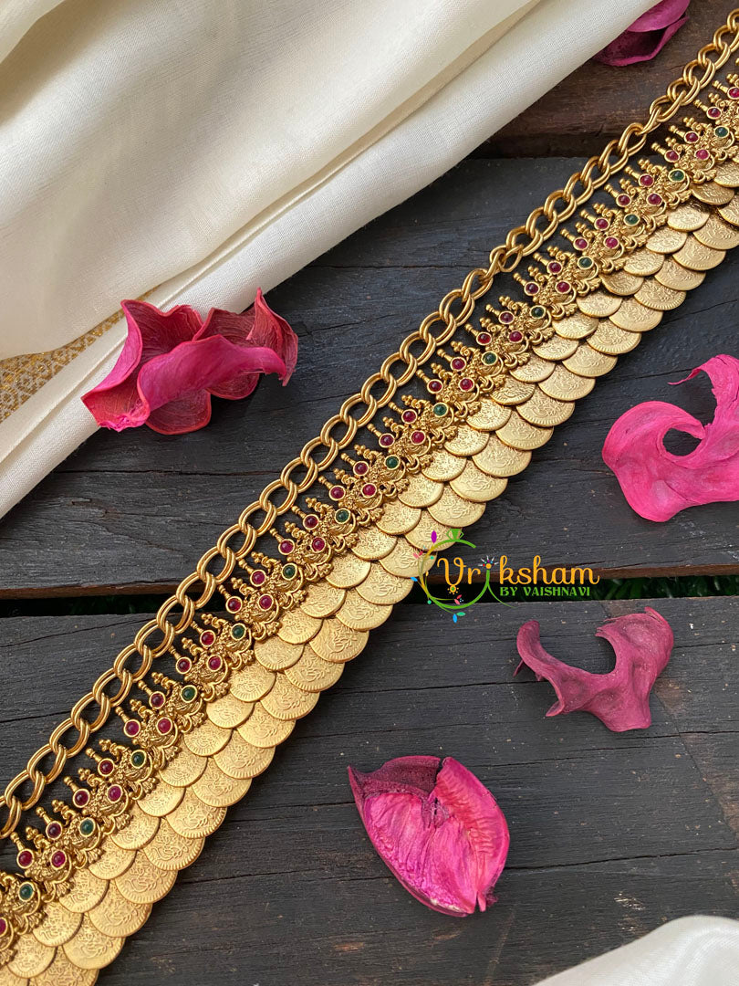 Kemp Lakshmi Kaasu Coin Hip chain -Temple Hip chain -Upper layer lined with red and green kemp stone and bottom Lakshmi engraved kaasu coin hip chain.