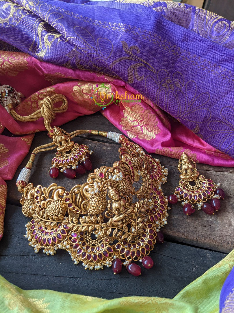 Precious Kemp Lakshmi Temple High Neck Choker -Precious Stone Kemp Lakshmi High Neck Choker is a gold look alike choker. Kemp Lakshmi Choker with a center lakshmi piece with two peacock on either side and a small floral bed on top of which it is all placed.