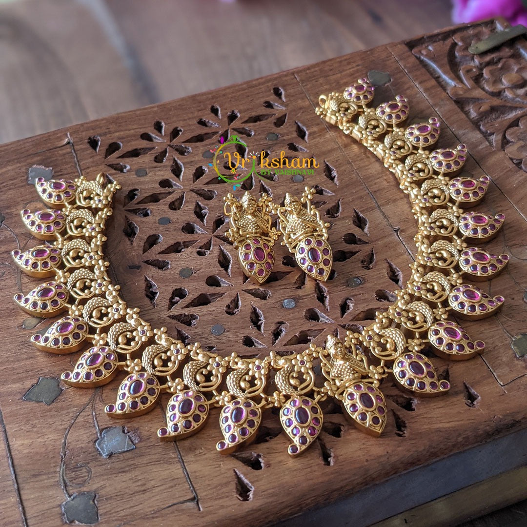 Kemp Maanga and Lakshmi Choker -Red kemp imitation stone studded with centre lakshmi idol and peacocks. Comes with matching studs.