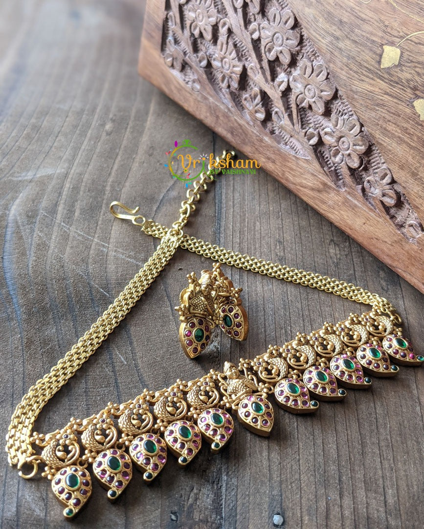 Kemp Maanga High Neck Choker Red Green kemp imitation stone studded with centre lakshmi idol and peacocks. Comes with matching studs.
