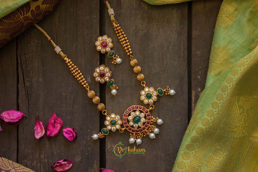 Gold Look Alike Premium Quality Kemp Neckpiece- Red-White-Green with earrings and back rope.