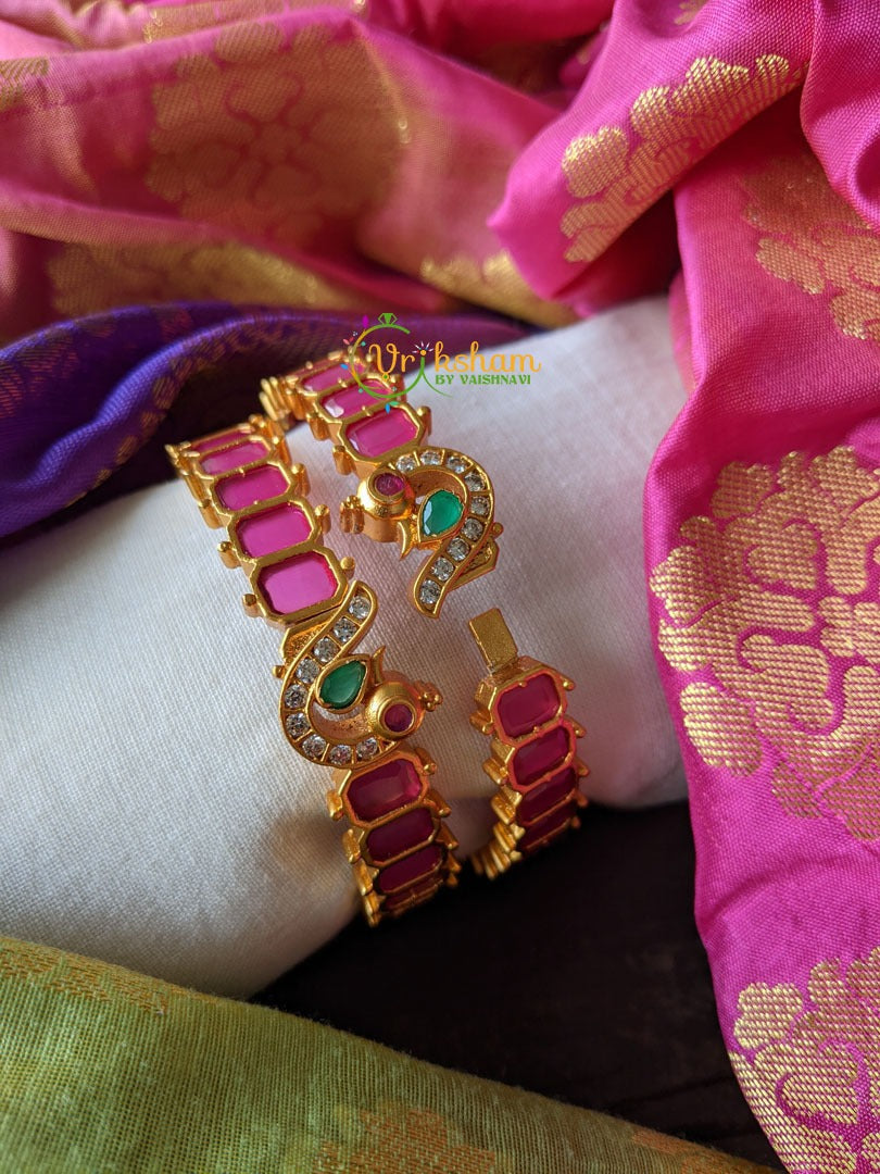 Kemp Openable Kada Type Bangles -Semi-Precious Kemp Bangles with AD stone peacock design that is openable like a kada, comes together as 2 bangles only. Bangles do not come as individual pieces.