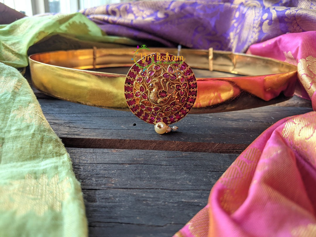 Kemp Peacock Plain Hipbelt with red semi precious kemp stones, with pearl drop.