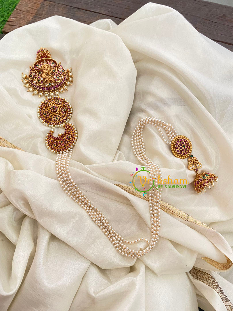 Precious Kemp Pearl Jada with Billai is a Gold look alike Billai which has a beautiful arrangement of pearl embellishments along the length of the billai and there are precious kemp pieces at the center.