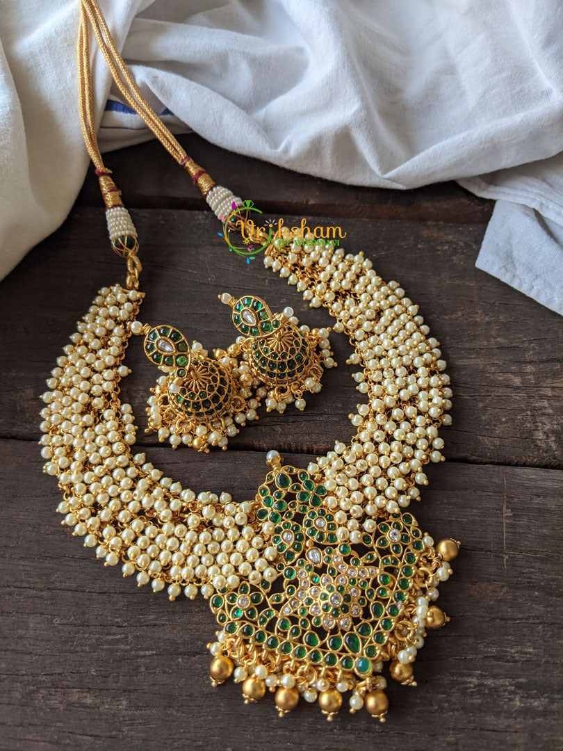 Kemp Pendant Cluster Pearl Choker - Green kemp and white ad stone studded Pendant and jhumkas. Golden bead finish. Comes with matching jhumkas.