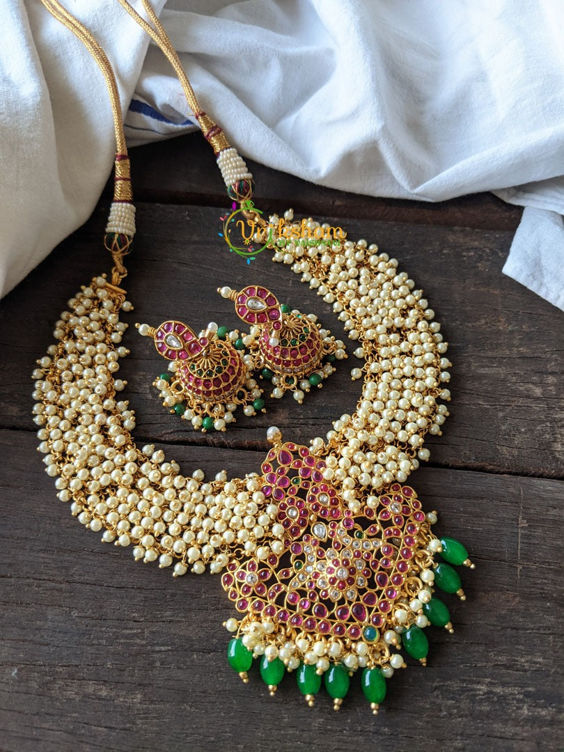 Kemp Pendant Cluster Pearl Choker - Red and Green kemp; white ad stone studded Pendant and jhumkas. Green bead & pearl finish. Comes with matching jhumkas.