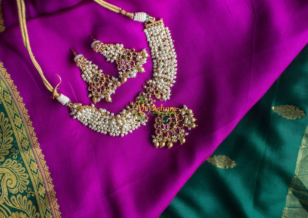 Kemp Pendant Cluster Pearl Choker – Red Green stone studded Pendant and jhumkas. Cluster pearl. Comes with matching danglers.