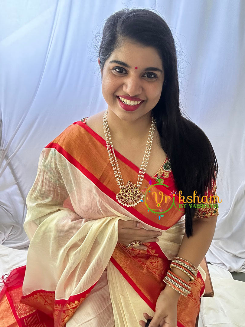 Traditional Kemp Pendant Pearl Mala - Red Green kemp stone studded pendant, Layers of tiny pearl maala with temple style pendant.