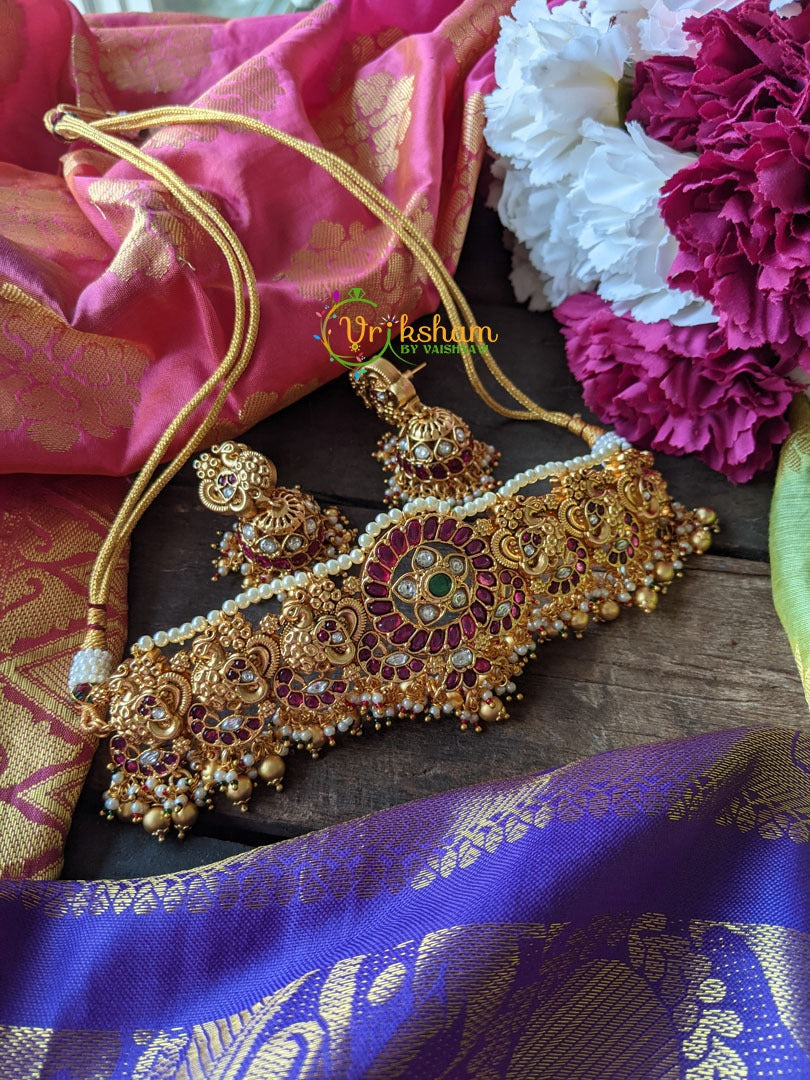 Precious Kemp Premium Matt High Neck Choker– high quality matt finish short neckpiece with red and green kemp and white ad stone and pearl finish, comes with matching jhumkas.