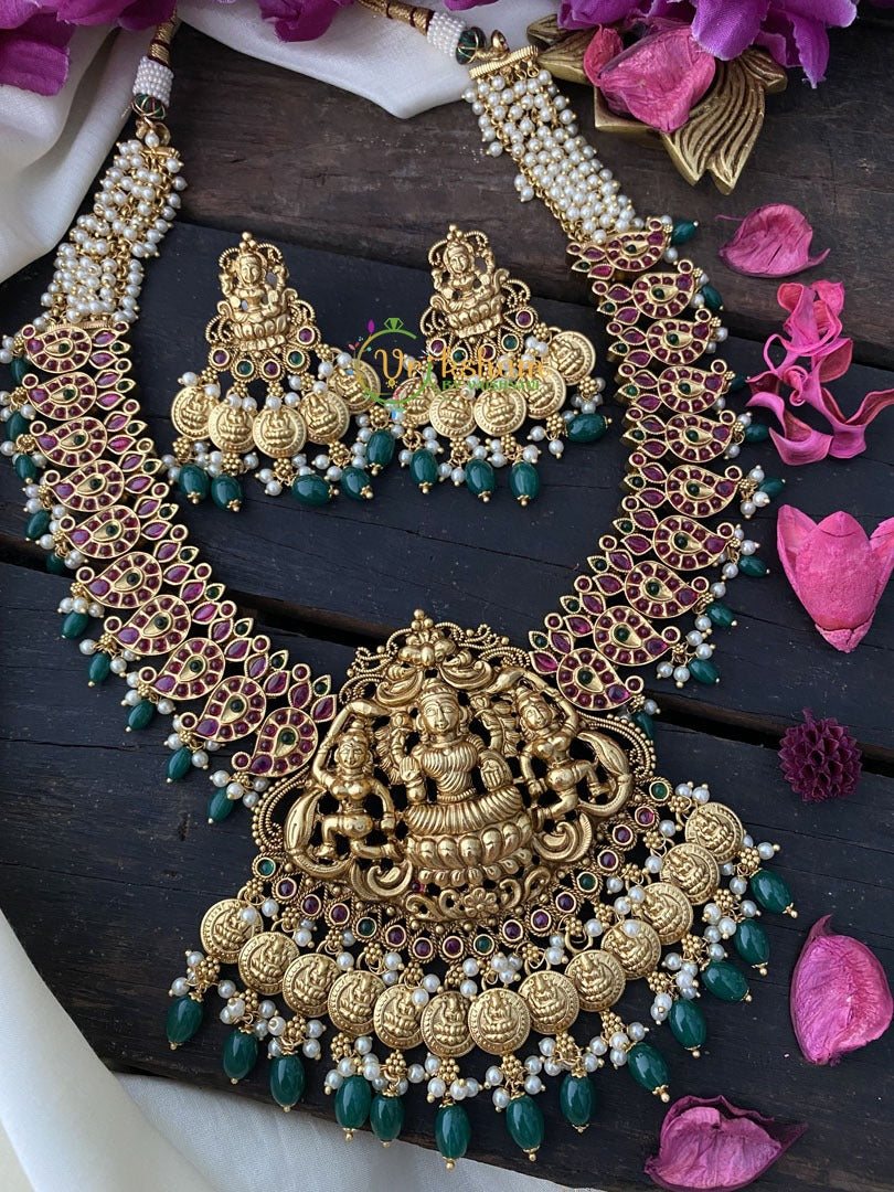 Premium Kemp Temple Lakshmi Neckpiece-centre lakshmi pendant paisley pattern arranged linearly– Temple jewelery with premium polished look. Comes with matching earrings.