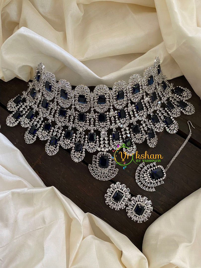 Blue Stone Kiara Advani Bridal Choker Set - American Diamond Bridal Set – studded american diamond jewelery with full white tone -set of high neck choker, ear danglers and Maang Tikka.