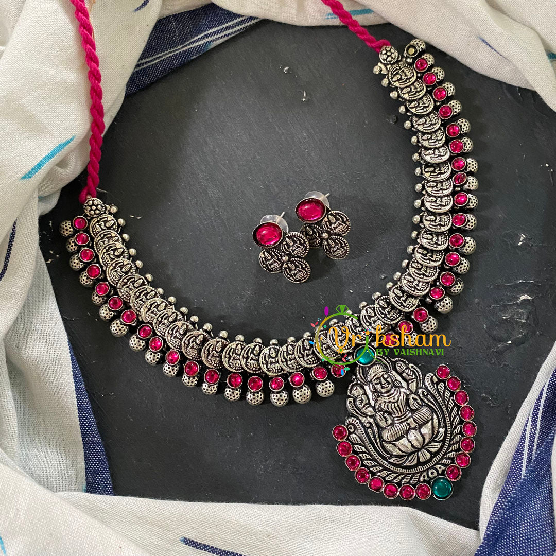 Red Green Stone Coin Kolhapuri Lakshmi Neckpiece pendant short neckpiece, comes with studs.