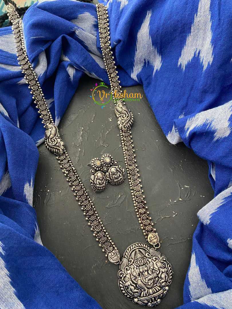 Kolhapuri Lakshmi Temple haram; Kolhapuri make, lakshmi pendant long neckpiece with peacock mugappu, Comes with a pair of laskhmi stud (Earrings design may vary from the picture).