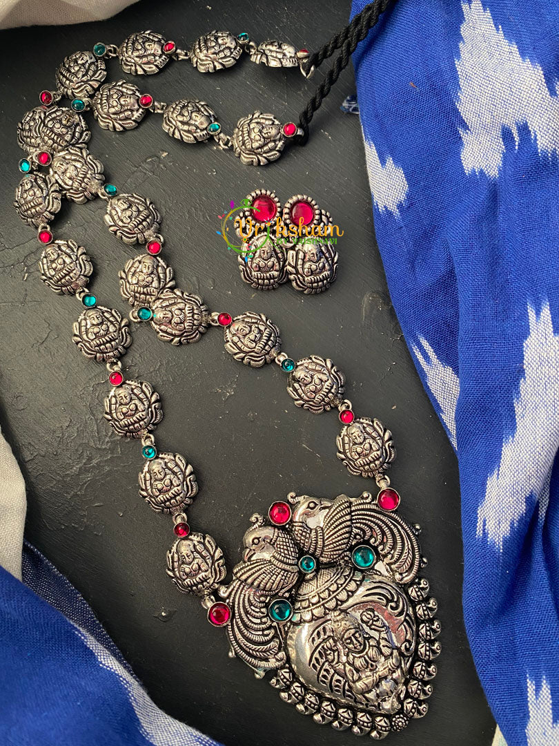 Design: Silver Lakshmi haram; with peacock sides, alternate green and pink/red stones with Lakshmi chain links.
