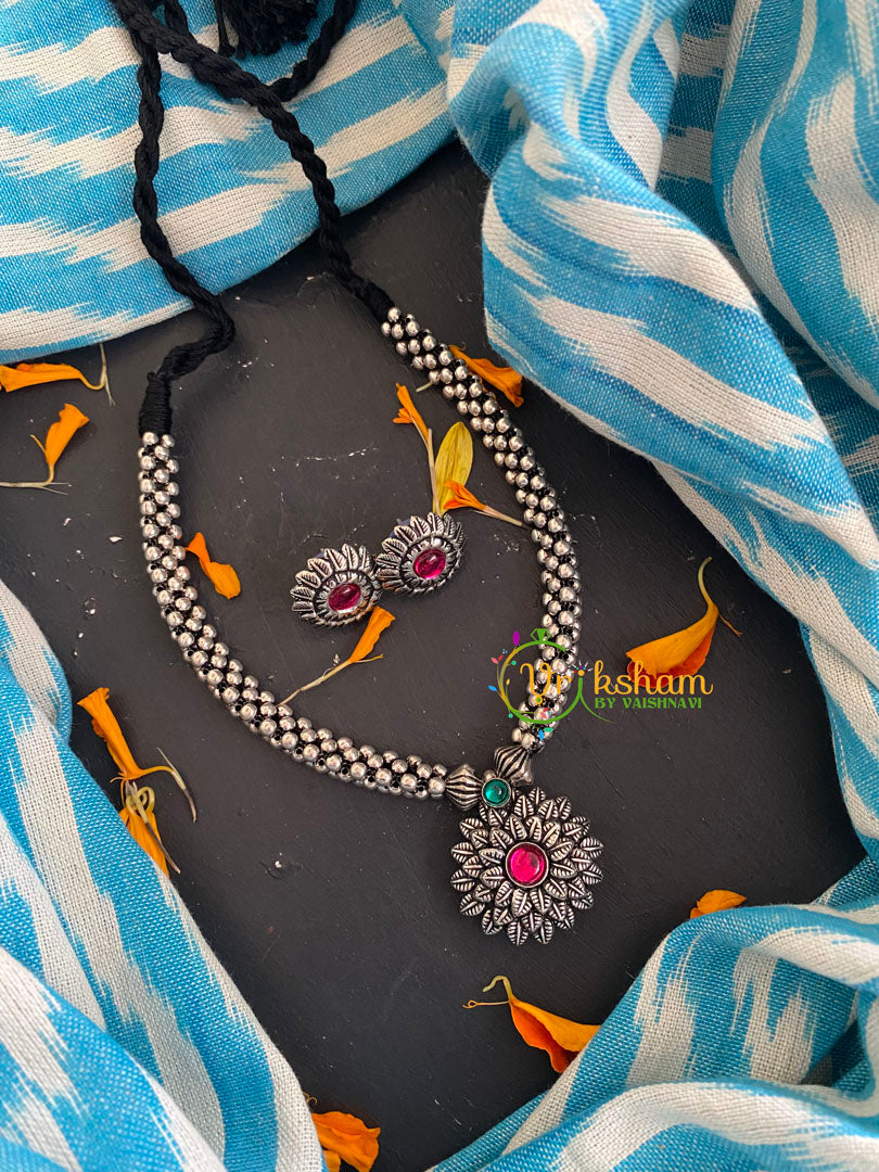Kolhapuri Pink Green Pendant Neckpiece – Silver look alike jewelry; one of a kind short neckpiece with adjustable black back rope/thread. Comes with earrings.