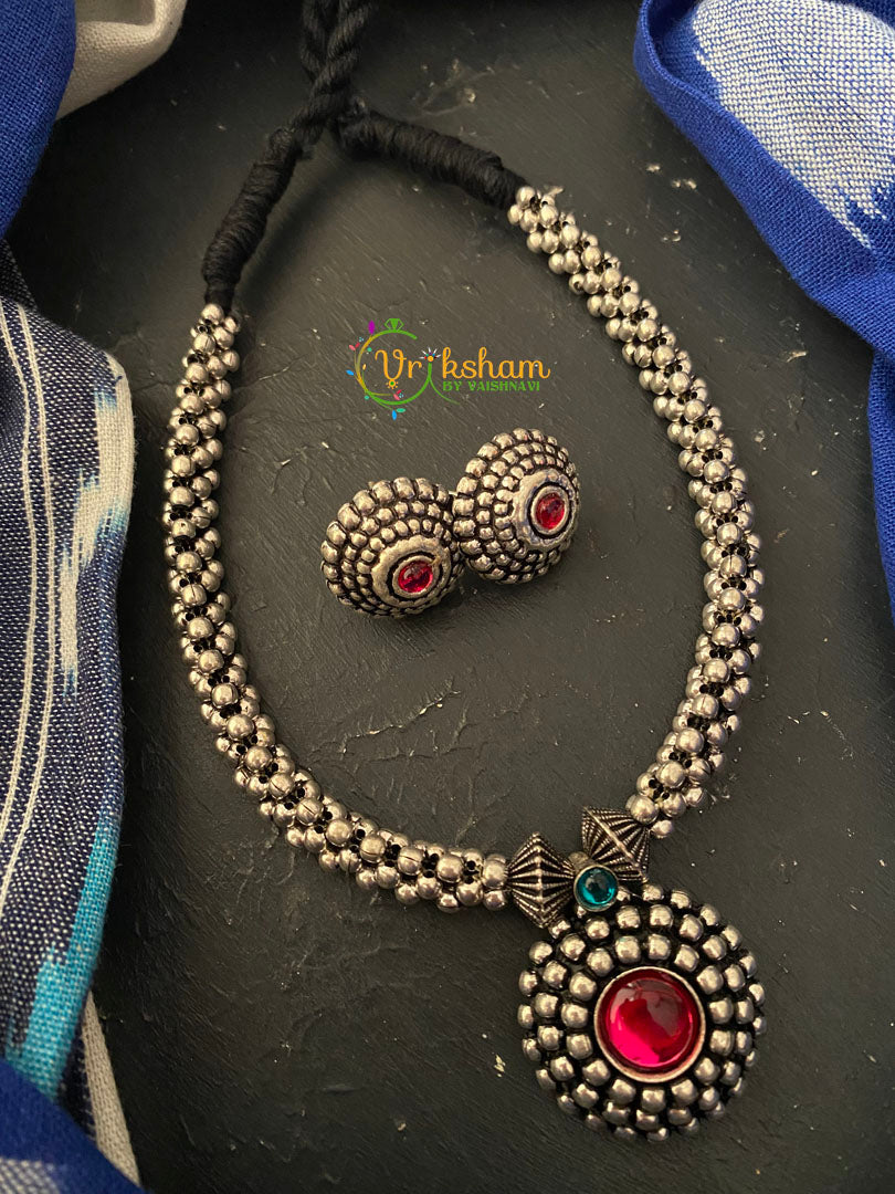 Kolhapuri Round Pendant Neckpiece -Silver look alike jewelry; one of a kind short neckpiece with adjustable black back rope/thread. Comes with earrings.